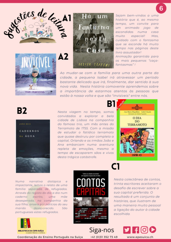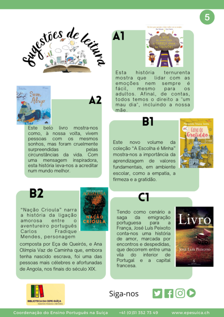 Em colaboração com a Equipa CSI e respondendo ao desafio lançado, o grupo Biblioteca da CEPE Suíça aventura-se por mares digitais, convidando todos os meses os leitores do Boletim Informativo Mensal (BIM), CEPE Suíça em ação, a ler as suas sugestões. Este repositório contempla as contribuições prestadas.